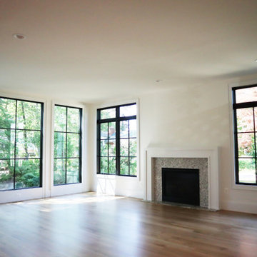 This new construction project embodies a fresh and masculine aesthetic with an efficient space plan for city living. Attention to scale was especially important in this townhouse setting. We took a creative approach to maximize the benefits of the open floorplan yet still define the respective function of each area. A large scaled custom built-in anchors the lounge area while balancing the kitchen and creating an organized, beautiful home for essentials and decor.