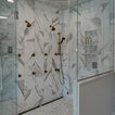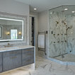 Beautifully incorporated white marble on floors, tops and shower walls with a soft grey on the cabinets all compliment each other.