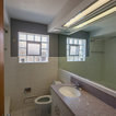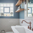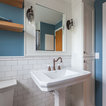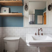 This is fun. Color and the tiles behind the toilet and sink. I like the wood shelves.