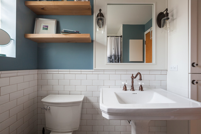 Bathroom - mid-sized craftsman kids' white tile and subway tile ceramic floor and white floor bathroom idea in Chicago with shaker cabinets, white cabinets, a two-piece toilet, blue walls and a pedestal sink — Houzz
