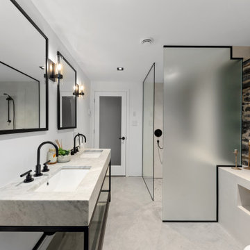 Inspiration for a large modern master gray tile and stone tile marble floor bathroom remodel in Philadelphia with an undermount sink, recessed-panel cabinets, white cabinets, marble countertops, a one-piece toilet and gray walls