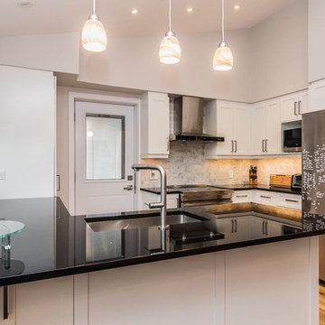 Amazing great room / modern kitchen. under mount stainless sinks, stainless appliances, showcase cabinets, glass lighting fixtures Cabinets and Countertops by Chris and Dick's, Salt Lake City, Utah.