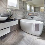 Inspiration for a contemporary l-shaped kitchen remodel in Brisbane with a double-bowl sink, flat-panel cabinets, dark wood cabinets, gray backsplash, mosaic tile backsplash, stainless steel appliances and an island — Houzz