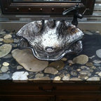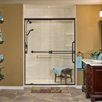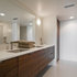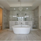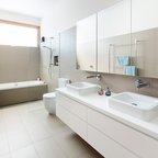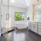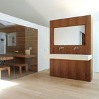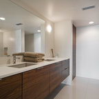 Inspiration for a modern freestanding bathtub remodel in Salt Lake City with flat-panel cabinets and dark wood cabinets — Houzz