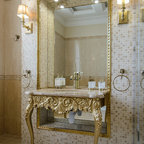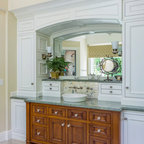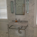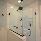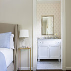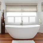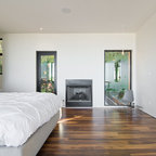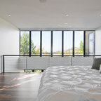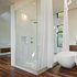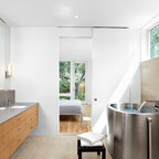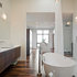When designing the master suite, privacy was of little concern. "It's high off the street and facing the thickly vegetated rear yard," Swindel says. Diffused natural light fills this upper level, creating a unique shower and bathing experience.