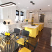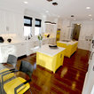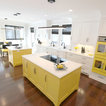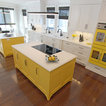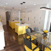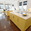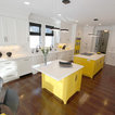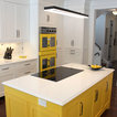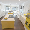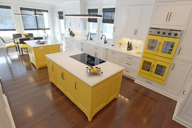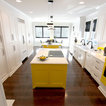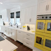 This stunning black and white kitchen with its punch of yellow was designed for a couple who love to cook and maintain a kosher kitchen. The attention to detail is incredible and evident - the storage use, amenities, the perimeter crown molding treatment, the convection double French door ovens, induction cooktop and cordless control blinds. The cabinets installed on the perimeter are Custom Wood Products Maple Vinyl, Bright White, Dull Rubbed and for the Islands custom painted to match Golden Orchards #329 Benjamin Moore accented with Chareau Collection ! Chalet knobs and pulls. Cambria Whitecliff Quartz was installed on the countertops with two Franke Fireclay Undermount sinks. Delta Brizo Venuto in Black faucets were installed. Jenn Aire 42" French door panel refrigerator, G.E. 36" Induction Cooktop and Downdraft, American Range 30" Yellow Double Ovens, Bosch dishwashers and Wolf 30" Warming drawer.