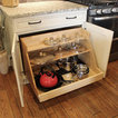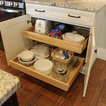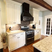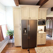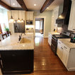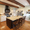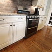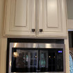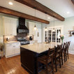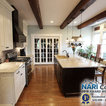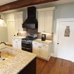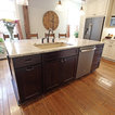 In this kitchen we installed Waypoint Livingspaces cabinets on the perimeter is 702F doorstyle in Painted Hazelnut Glaze and on the island is 650F doorstyle in Cherry Java accented with Amerock Revitilize pulls and Chandler knobs in oil rubbed bronze. On the countertops is Giallo Ornamental 3cm Granite with a 4” backsplash below the microwave area. On the wall behind the range is 2 x 8 Brickwork tile in Terrace color. Kichler Avery 3 pendant lights were installed over the island. A Blanco single bowl sink in Biscotti color with a Moen Waterhill single handle faucet with the side spray was installed. Three 18” time weathered Faux wood beams in walnut color were installed on the ceiling to accent the kitchen.