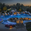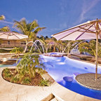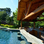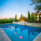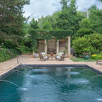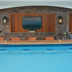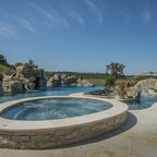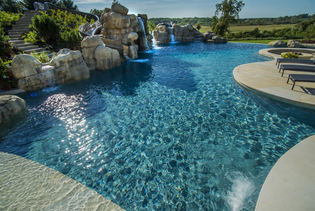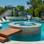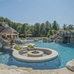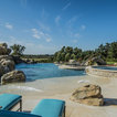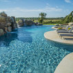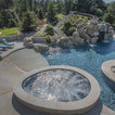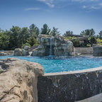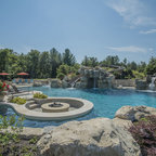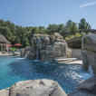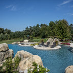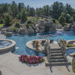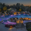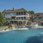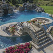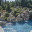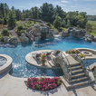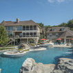 This amazing home features a backyard patio and pool area with a spectacular custom pool with many features including island which feature sitting areas and fire pit a spa as well as incredible slide which goes into the swimming pool. The pool measures roughly 2300 square feet, and has a deep end of 10'0". The spa is raised and has 12 therapy heads. There is LED colored lighting throughout the project. There is a 300 square foot zero depth beach entry into the pool with agitator jets to keep the water moving. There is also a sunshelf within the pool. The lazy river wraps around the sunken island, and the current in the lazy river is propelled by a commercial waterpark quality pumping system. The sunken island has lighting, a fire pit, and a bridge connecting it to the decking area. There is an infinity edge on one edge of the pool. The pool also has an in-floor cleaning system to keep it clean and sanitary. The swimming pool also has the ability to change colors at night utilizing the amazing LED lighting system. The pool and spa exposed aggregate finish is French Gray color. The slide that cascades down the grotto is custom built. The waterfall grotto also provide a thrilling jump off point into the deepest part of the pool. This amazing backyard was designed and built for a home in Bull Valley Illinois.