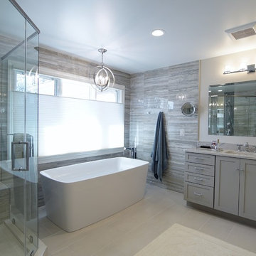 Example of a large transitional master slate floor bathroom design in Richmond with an undermount sink, shaker cabinets, soapstone countertops and gray cabinets