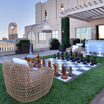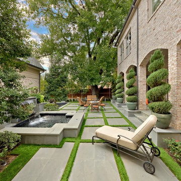 A recently completed country French estate in Dallas, Texas. This home features expansive gardens, stone walls, antique limestone paving, a raised pool, a putting green, fire pit and lush gardens with relaxing shade and blooming shrubs.
