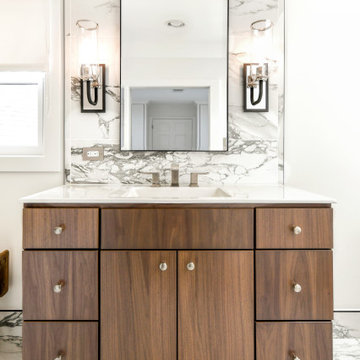 Bathroom - large transitional master gray tile and matchstick tile gray floor and porcelain tile bathroom idea in DC Metro with medium tone wood cabinets, gray walls, an undermount sink, white countertops, marble countertops and flat-panel cabinets