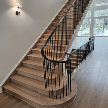 While the exterior materials contrast a calm, minimal palette with the sleek lines of the gabled silhouette, the interior spaces embody a playful, artistic spirit. From the hand painted De Gournay wallpaper in the master bath to the rugged texture of the over-grouted limestone and Portuguese cobblestones, the home is an experience that encapsulates the unexpected and the timeless.