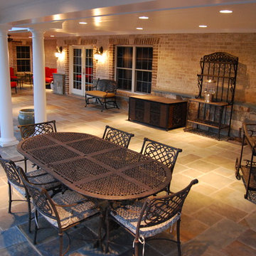 Large elegant backyard stone patio kitchen photo in Manchester with a gazebo
