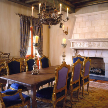 Trendy dark wood floor dining room photo in Denver with blue walls and a standard fireplace