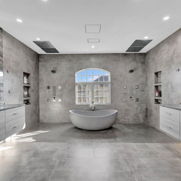 The Master Bathroom remodel started by replacing the standard windows with a single glass pane that enhanced the view of the outdoors. The dated shower was replaced by a walk-in shower and soaking tub to create the ultimate at-home spa experience. Lighted LED mirrors frame His & Hers sinks and bathe them in a soft light.