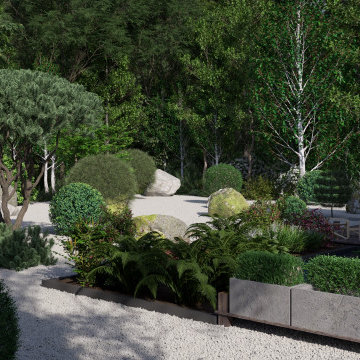 Minimalist freestanding desk carpeted home office photo in San Francisco with gray walls