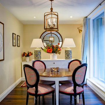 Designed for a 1930s Portland, OR home, this kitchen remodel aims for a clean, timeless sensibility without sacrificing the space to generic modernism. Cherry cabinets, Ice Stone countertops and Heath tile add texture and variation in an otherwise sleek, pared down design. A custom built-in bench works well for eat-in breakfasts. Period reproduction lighting, Deco pulls, and a custom formica table root the kitchen to the origins of the home.