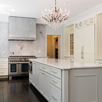 White macauba countertops create a harmonious color palette while the decorative backsplash behind the range adds both pattern and texture. Kitchen design and custom cabinetry by Studio Dearborn. Interior design finishes by Strauss House Designs LLC. White Macauba countertops by Rye Marble. Refrigerator, freezer and wine refrigerator by Subzero; Range by Viking Hardware by Lewis Dolan. Sink by Julien. Over counter Lighting by Providence Art Glass. Chandelier by Niche Modern (custom). Sink faucet by Rohl. Tile, Artistic Tile. Chairs and stools, Soho Concept. Photography Adam Kane Macchia.