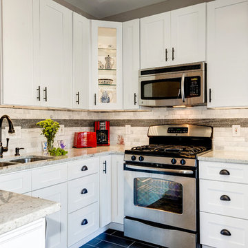 Some clients have such great taste, that it’s easy to help create the kitchen of their dreams. Our client in this case had such passion for the design of her own kitchen that it made it such a fun collaborative experience that you don’t always get with clients. She put her heart and soul into making sure every detail was exactly the way she wanted. This kitchen is only a small piece of a well-appointed home. The 1” thick custom door (from Bilotta’s private custom cabinet collection), traditionally styled, yet not overly so, matches beautifully with the details of the adjacent rooms. The grey colored cabinetry blends with the colors in the adjoining rooms creating the perfect centerpiece. The client chose a massive stone Francois & Co. Toulouse Shelf w/ Concave Stack hood from a dealer in London and had it shipped over on a boat! She selected beautiful “Mother of Pearl” knobs from Anthropologie and adorned select cabinets with them like pieces of jewelry. The naturally pearlescent clay tile, the Quartzite countertops and the lanterns above the island were all chosen to mirror these knobs. The lanterns were also chosen to replicate the movement of the gold pattern in the knobs. The client opted to turn the tile on the diagonal as it felt more fluid and in keeping with the movement in the knobs and lanterns. The stone hood, tile, and quartzite sample coordinated perfectly. The room was equipped with a mix of SubZero Wolf and Miele appliances with a Kohler apron sink. The space of course has the perfect amount of accessories for making it more than just visually appealing – it’s a baker’s dream with a lift up for a frequently used mixer. There’s a built-in paper towel holder and just the right amount of utensil dividers, cutlery dividers, tray dividers, roll-outs and even a secret pantry with matching cabinetry hidden in the corner.
