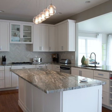 Within this amazing accessory dwelling unit, we find a full "L-Shaped" Kitchenette with gray, shaker styled cabinets, a white granite counter top, matched with stainless steel fixtures and appliances for an outstanding finish to the kitchen area.
