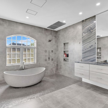 Inspiration for a transitional white tile and subway tile cement tile floor and multicolored floor drop-in bathtub remodel in Atlanta with raised-panel cabinets, gray cabinets, gray walls and an undermount sink