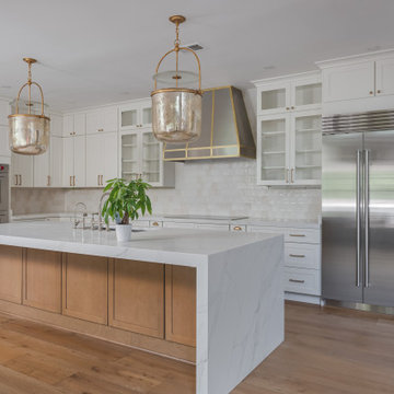 Example of a mid-sized classic u-shaped light wood floor and beige floor open concept kitchen design in San Diego with an undermount sink, shaker cabinets, white cabinets, granite countertops, beige backsplash, porcelain backsplash, stainless steel appliances and an island