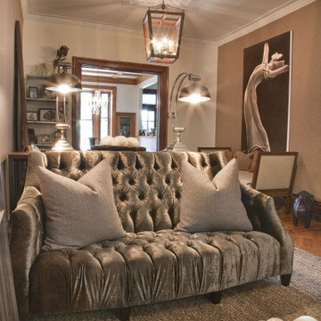 Living room - mid-sized transitional formal and enclosed carpeted living room idea in New York with beige walls