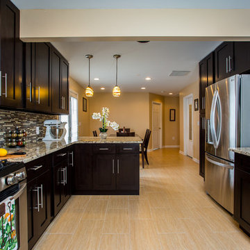 Example of a mid-sized classic dark wood floor and brown floor eat-in kitchen design in Los Angeles with stainless steel appliances, raised-panel cabinets, dark wood cabinets, multicolored backsplash, mosaic tile backsplash, a farmhouse sink, quartz countertops, an island and white countertops