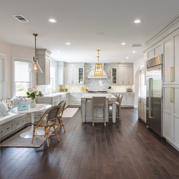 Mid-sized beach style u-shaped brown floor and dark wood floor kitchen photo in Bridgeport with an undermount sink, white cabinets, quartz countertops, white backsplash, ceramic backsplash, stainless steel appliances, an island, gray countertops and recessed-panel cabinets