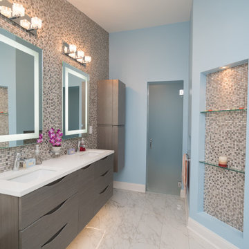 The designer opened up the closed off shower by removing the soffit and dark cabinet next to the shower to add glass and let light in. Now the entire room is bright and airy with marble look porcelain tile throughout. The archway was added to frame in the under-mount tub. The double vanity in a soft gray paint and topped with Corian Quartz compliments the marble tile. The new chandelier along with the chrome fixtures add just the right amount of luxury to the room. Now when you come in from the bedroom you are enticed to come in and stay a while in this beautiful space.