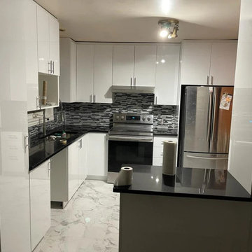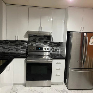 Elegant l-shaped kitchen photo in Boston with stainless steel appliances, a farmhouse sink, white cabinets, white backsplash and subway tile backsplash