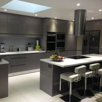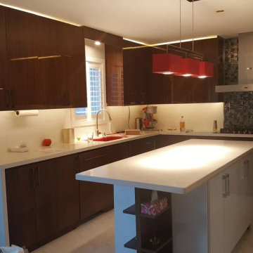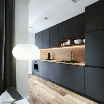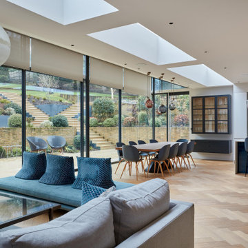 Modern kitchen with rift-cut white oak cabinetry and a natural stone island.
