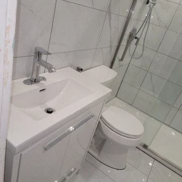 Transitional beige tile beige floor bathroom photo in Salt Lake City with beige walls and a hinged shower door