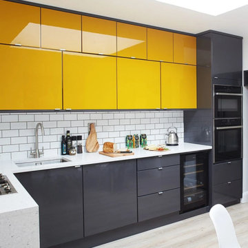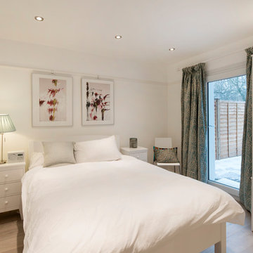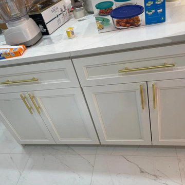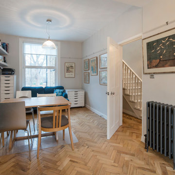 The goal for this Point Loma home was to transform it from the adorable beach bungalow it already was by expanding its footprint and giving it distinctive Craftsman characteristics while achieving a comfortable, modern aesthetic inside that perfectly caters to the active young family who lives here. By extending and reconfiguring the front portion of the home, we were able to not only add significant square footage, but create much needed usable space for a home office and comfortable family living room that flows directly into a large, open plan kitchen and dining area. A custom built-in entertainment center accented with shiplap is the focal point for the living room and the light color of the walls are perfect with the natural light that floods the space, courtesy of strategically placed windows and skylights. The kitchen was redone to feel modern and accommodate the homeowners busy lifestyle and love of entertaining. Beautiful white kitchen cabinetry sets the stage for a large island that packs a pop of color in a gorgeous teal hue. A Sub-Zero classic side by side refrigerator and Jenn-Air cooktop, steam oven, and wall oven provide the power in this kitchen while a white subway tile backsplash in a sophisticated herringbone pattern, gold pulls and stunning pendant lighting add the perfect design details. Another great addition to this project is the use of space to create separate wine and coffee bars on either side of the doorway. A large wine refrigerator is offset by beautiful natural wood floating shelves to store wine glasses and house a healthy Bourbon collection. The coffee bar is the perfect first top in the morning with a coffee maker and floating shelves to store coffee and cups. Luxury Vinyl Plank (LVP) flooring was selected for use throughout the home, offering the warm feel of hardwood, with the benefits of being waterproof and nearly indestructible - two key factors with young kids!