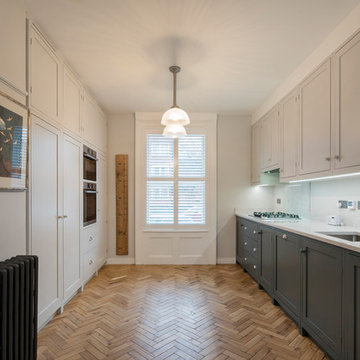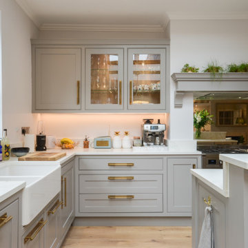 Kitchen - transitional u-shaped light wood floor, beige floor, exposed beam and wood ceiling kitchen idea in Chicago with a farmhouse sink, recessed-panel cabinets, gray cabinets, gray backsplash, glass tile backsplash, stainless steel appliances, an island and white countertops