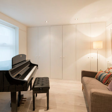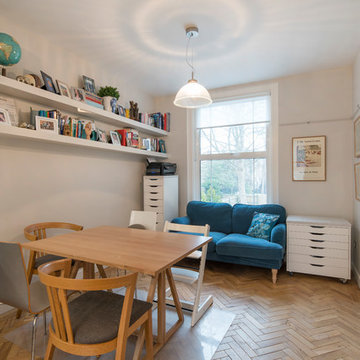 When a 7 year old Brooklyn hip-kid is also an animal lover, you get this woodland boy's room, designed to grow and maximize storage. This small kid's bedroom features a storage bed, wall shelves, a spacious desk hutch, and a storage ottoman to accommodate ample toys and books, as well as a custom designed closet to suit a growing child's needs. Hipster Animals removable wallpaper is fun for a 7 year old, but still cheeky and cool enough for a teen. And while woodland animals abound, they are balanced by mature decor elements like neutral colors, dark blues, boyish plaid, and chic wool and leather textures meant to grow with child. This room is one of our favorite small space designs - it's fun, personalized, and makes the space look bigger--while also providing storage and function.