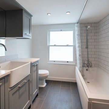 Kitchen - traditional kitchen idea in Chicago with recessed-panel cabinets, white cabinets, granite countertops, white backsplash and subway tile backsplash
