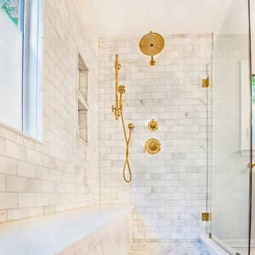 Bold Striato Olimpo “Leather” floor tiles in a chic chevron pattern and Jeffrey Court Calcutta Mini Sticks as accent tile next to plain white porcelain squares create depth and texture without being visually overwhelming. The monochromatic palette is complemented by the Dunn Edwards Grey Owl on the walls and the natural light streaming in keeps this space bright and vibrant. The Hansgrohe “Puravi” tub faucet is a nod to super modern and contemporary design while the sliding door hints to a rustic inspiration. The Duravit oval tub gives this primary suite an element of coziness without sacrificing aesthetic.