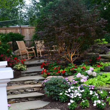 This is an example of a traditional front porch design in New York with decking and a roof extension.