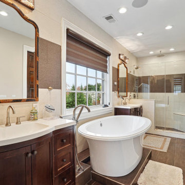 Alcove shower - mid-sized contemporary 3/4 brown tile and mosaic tile porcelain tile and gray floor alcove shower idea in Denver with a vessel sink, flat-panel cabinets, medium tone wood cabinets, a wall-mount toilet, beige walls, marble countertops, a hinged shower door and brown countertops