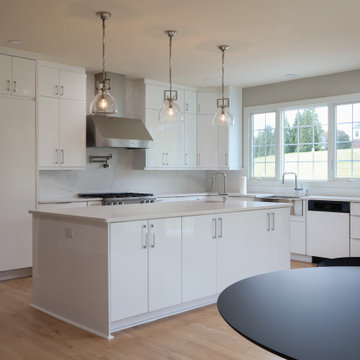 Kitchen remodel in early 1900s home, includes granite countertops and backsplash, oak flooring, painted custom cabinetry.