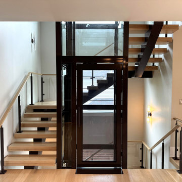 10" Select White Oak Plank with a custom stain & finish. Solid White Oak Stair Treads & Risers.