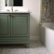 Mid-sized minimalist master white tile and porcelain tile porcelain floor and white floor bathroom photo in Chicago with raised-panel cabinets, green cabinets, a two-piece toilet, beige walls, an undermount sink, engineered quartz countertops and white countertops — Houzz