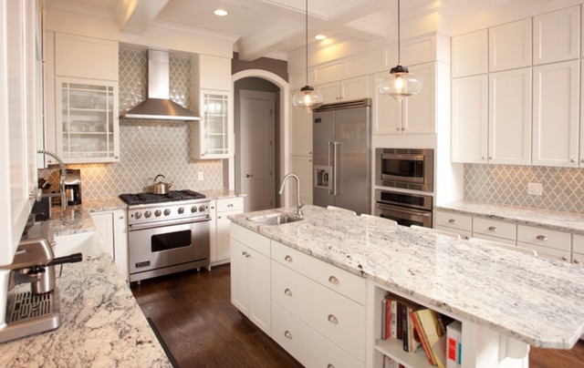 Inspiration for a large transitional galley dark wood floor enclosed kitchen remodel in Cincinnati with an undermount sink, shaker cabinets, white cabinets, marble countertops, gray backsplash, ceramic backsplash, stainless steel appliances and an island — Houzz
