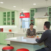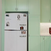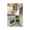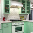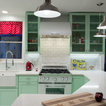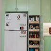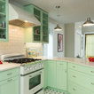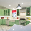 AFTER: The new custom cabinets, from Bellmont Cabinet Co., are painted a minty green. They include a wastebasket pullout to the right of the sink, rollout shelves in all the standard base cabinets and six glass door fronts, which Lambert included to make the space feel more open.