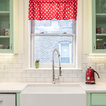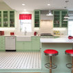A retro 1950’s kitchen featuring green custom colored cabinets with glass door mounts, under cabinet lighting, pullout drawers, and Lazy Susans. To contrast with the green we added in red window treatments, a toaster oven, and other small red polka dot accessories. A few final touches we made include a retro fridge, retro oven, retro dishwasher, an apron sink, light quartz countertops, a white subway tile backsplash, and retro tile flooring.