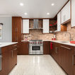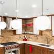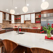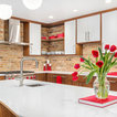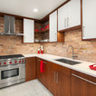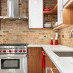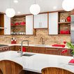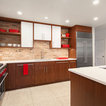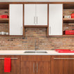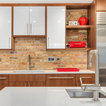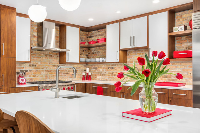 A contemporary, Mid-Century Modern kitchen refresh with gorgeous high-gloss white and walnut wood cabinetry paired with bright, red accents. The flooring is a beautifully speckled Terrazzo tile. Open shelving against a reclaimed brick backsplash is brightened up with recessed lighting. Our designer, Mackenzie Cain, created this truly unique kitchen for these stylish homeowners.