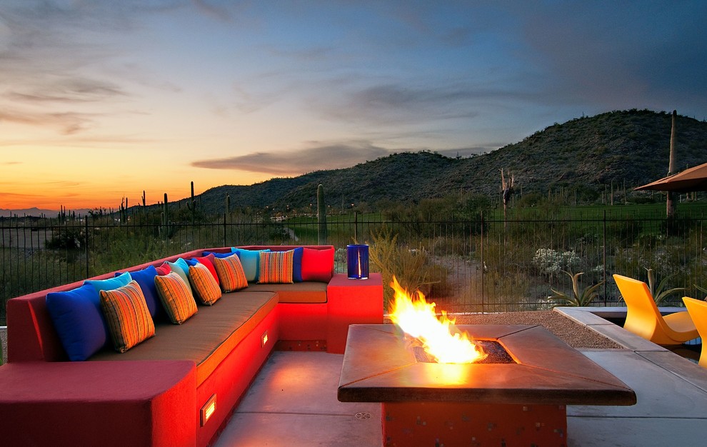 Desert drama: Red concrete bench with colorful pillows and a colored concrete fire pit. Using vibrant colors for your...