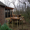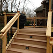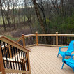 TimberTech deck with cedar lifestyle rails and black Deckorator Pickets. A beautiful transition from the second story screen porch to the backyard.
