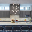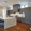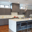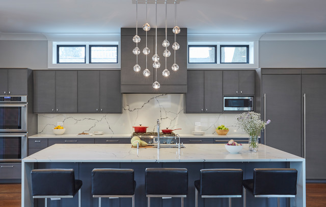 Frameless cabinetry in an quarter sawn oak with a grey finish over it. The counter tops are quartz and run up the back splash. The island is big and spacious with a beautiful big sink. This kitchen is simple and simply beautiful. Designed by Jennifer Rahahley for DDK Kitchen Design Group. Cabinets by Dutch Made Cabinetry. Photograph by Mike Kaskel.